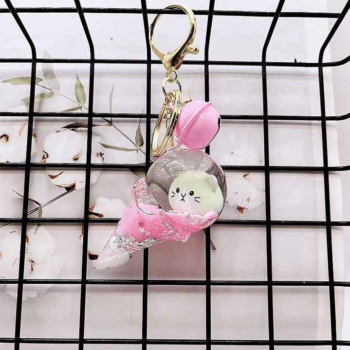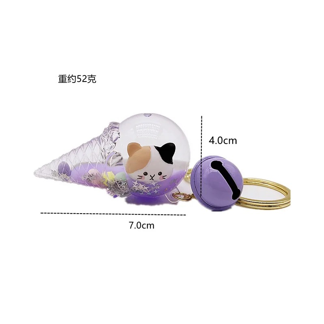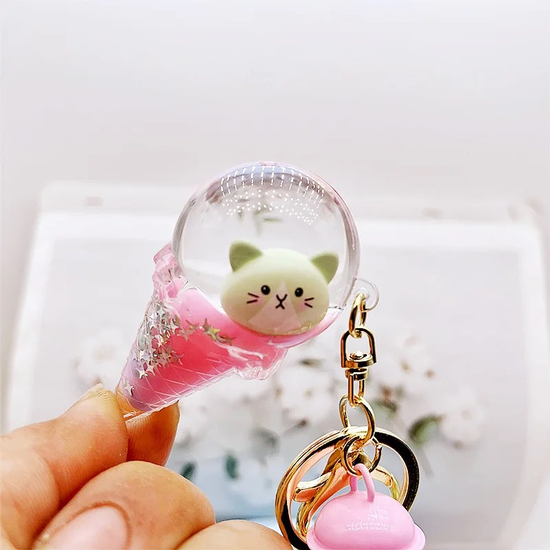 Llavero con forma de helado, relleno con cabeza de gatito y aceite de color.